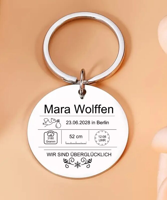 Der baby schlüsselanhänger ist ein einzigartiges Erinnerungsstück, das aus deinem Alltag etwas Persönliches macht. Hergestellt aus langlebigem Edelstahl und top graviert mit allen wichtigen Geburtsdaten deines Kindes – Gewicht, Uhrzeit, Größe, Geburtsort und Datum – ist dieser Anhänger so individuell wie dein Baby selbst. Mit seinem praktischen 2,5-cm-Durchmesser passt er perfekt an jeden Schlüsselbund und bietet eine klare, gestochen scharfe Gravur, die dauerhaft bestehen bleibt. Dieser Anhänger verbindet emotionalen Wert mit hochwertiger Verarbeitung und sorgt dafür, dass du die wichtigsten Momente deines Lebens immer bei dir tragen kannst. Für viele Eltern wird er zu einem täglichen Begleiter, der bei jeder Berührung ein warmes Gefühl weckt und an den Zauber der Geburt erinnert.